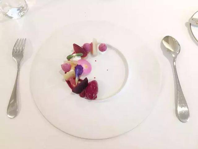 摆盘Hin美的一道,吃完对主厨的敬意又升高了一个Level。这一盘就是甜菜根的n+1种吃法,烤的、腌渍的、雪葩、果冻,还有一种小时候大米花的吃法,太厉害了。但不得不说,甜菜根的土腥味还是在雪葩中吃到了。