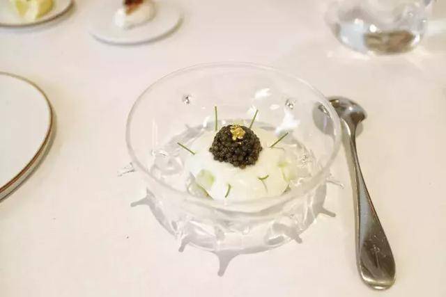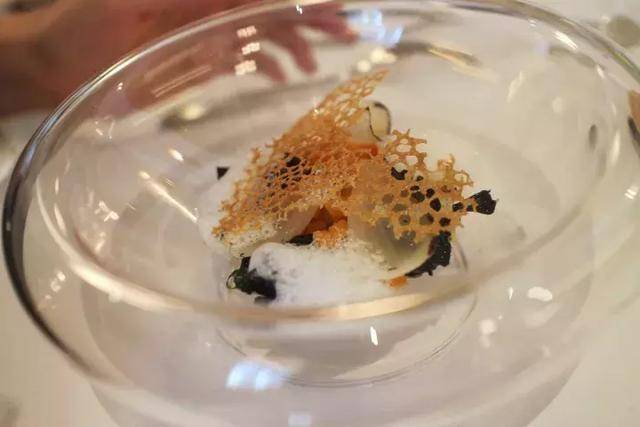 可爱的海胆造型器皿里,有点缀著金箔的上等鱼子酱(Oscietra Caviar),下面是白色的贻贝小云朵(Mussel Cloud),盖着海鳌虾(Langoustine Tartare)和北海道的海胆,点缀的青苹果和青草,很好的中和了海鲜的腥气。