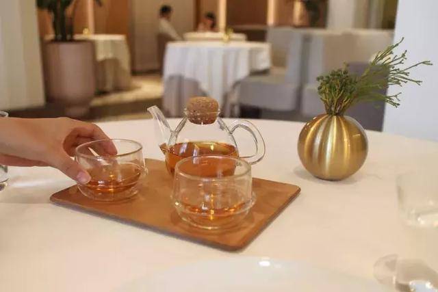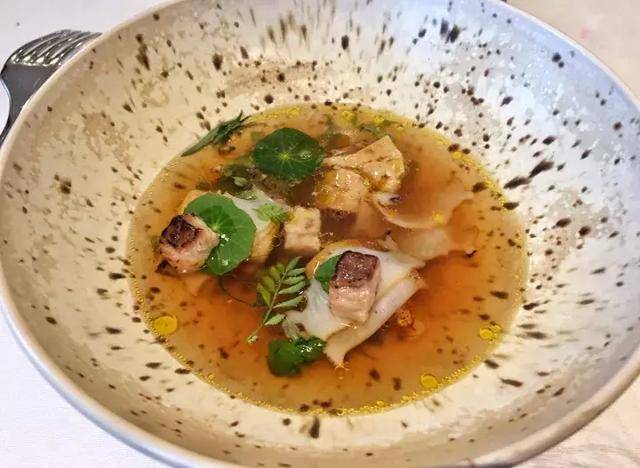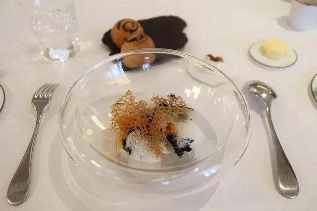 把香菇浓汤做成清澈版确实是头一次体验,浓郁的一杯“茶”还喝到了荞麦,搭配用松露油烤过的面包,正餐还没开始,就被这两道餐前小吃俘获了味蕾。