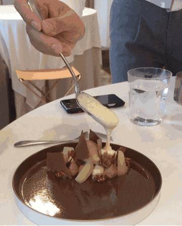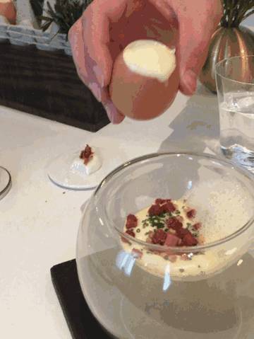 这颗略带橙色的有机蛋,是主厨在65.3度的水中精心煮了55分钟达到的效果,搭配玻璃碗中的烤土豆和黑松露酱,浓郁的口感可以说是很完美了。(数据来自造洋饭书 点我可以看到他写的Odette)