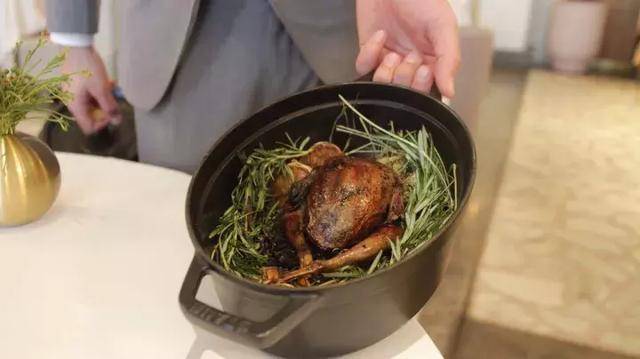 在上菜之前,General Manager拿着椭圆形铸铁锅,告诉我们准备好相机。打开锅盖,让我们拍了一下,是一只完整的烤鸽子。我寻思著这怎么吃,结果经理说这道菜才完成一半,要回厨房继续烹饪,然后就端走了…