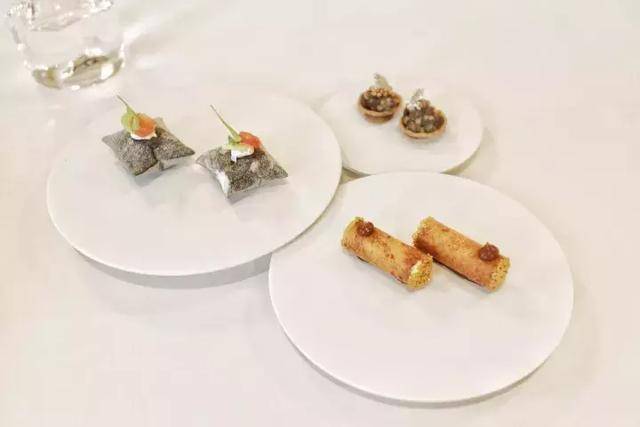 菜单未上,先来了三小碟餐前小吃。分别为枕头形的竹碳鹰嘴豆泥夹心饼干,鱼子酱塔,和长的像雪茄的虾卷。虾卷的脆皮裹着入口即化的酱,味道特别丰富,是三个里面最好吃的。