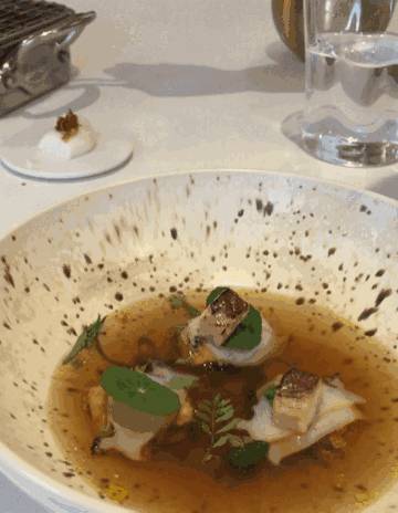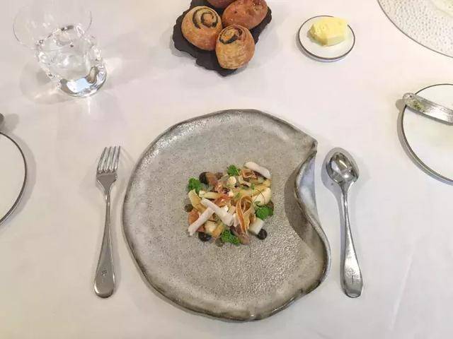 等菜间隙,面包如期而至,还带着余温的黑松露酥皮卷、黑麦酸面包和蜂蜜焦糖餐包散发着香气。黑麦酸面包味道平平,但黑松露和蜂蜜餐包真是好吃到想买一篮回家。虽然都是自家烘焙的,但比起米其林一星的Corner House(点击文字看相关文章)真是上了好几层台阶。果真没有对比就没有伤害。
