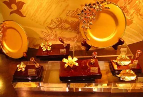 这些配饰都由天然胡姬花朵制成,胡姬花是新加坡的国花,在这里一朵朵端庄清丽的胡姬花被制作成标本并被浸染在18K或22K的金液中,使其成为极具装饰美感的别针、耳环、项链等。