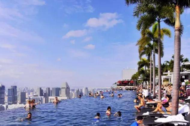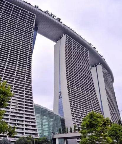 新加坡最大的酒店,其三座55层高的塔楼拥有2560间豪华客房。建筑由萨夫迪(Moshe Safdie)设计,三座塔楼呈26度倾斜姿态,其笔直塔身相交于第23层楼。位于57层并横跨在三座塔楼顶部的金沙空中花园(Sands Sky Park),耗资1亿多美元建造,占地1.24万㎡,距离地面200多米,向海湾的方向延伸。花园全长340米,比横躺下的埃菲尔铁塔还要长,而且尺度宽阔,足以停放4.5架A380大型喷气式客机。