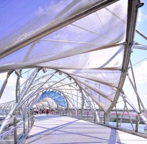 设计人员受DNA结构的启发,让这座桥梁体现“生命与延续、更新与成长”的意义。采用不锈钢钢管建造的两条螺旋曲线朝相反方向相互缠绕,盘旋形成长达280米的核心结构。其中,内螺旋用于支撑遮阳的多孔玻璃和不锈钢网状天篷。
