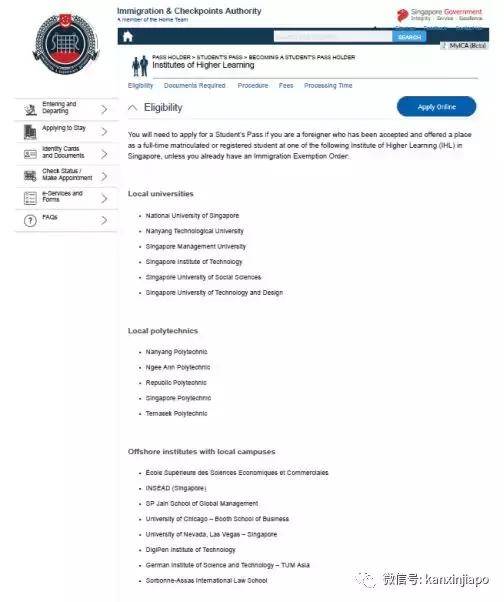 新加坡移民厅网站列出的IHL高等教育大学名单