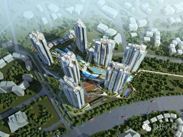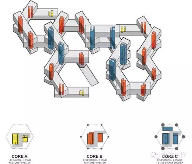 这个项目有趣的地方是,这么多零散的体块如何组织成一个如此高密度住宅体,但同时又保证私密性和从效果图中看到的长范围的视线景观。叠置的策略带来的第二个结构是,公共空间可以与热带植物交织在一起。从平面图上看,块与块之间的空旷空间形成了一系列内庭院。从而使次项目形成了一个丰满的竖向社区,而不是此区域中随处可见的单调塔楼项目。大量的住宅辅助设施也交融在这片绿色中,为社会交流、休闲和娱乐提供了大量机会。