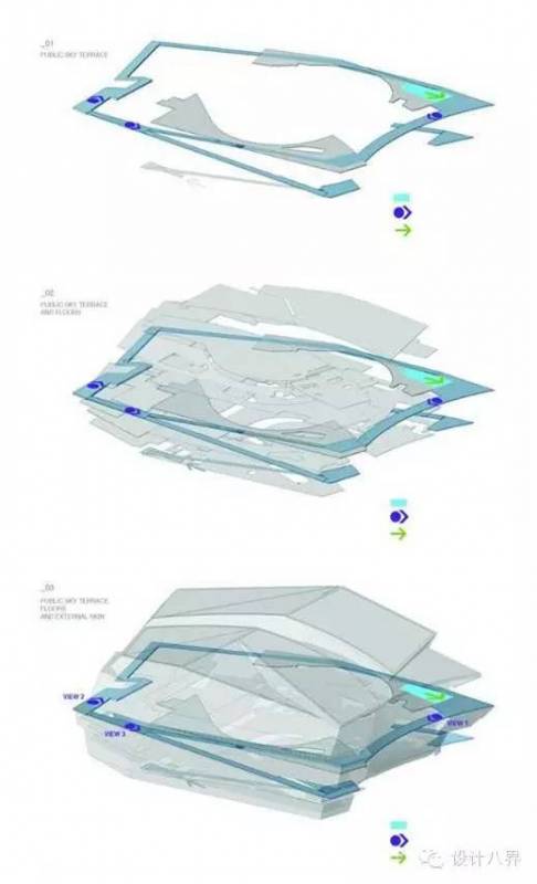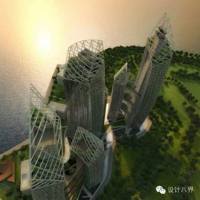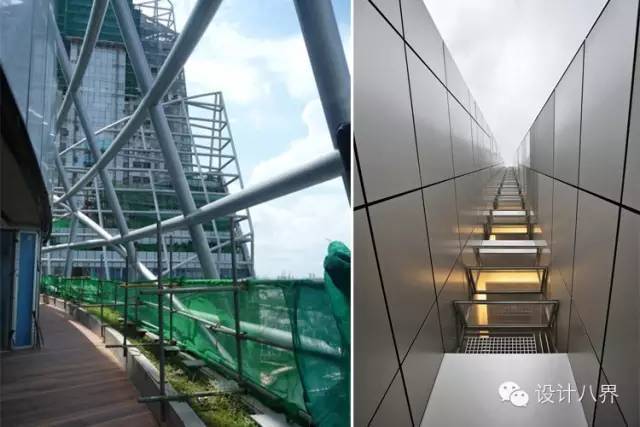 高楼顶部皆有花园,包围在一个开放式的结构框架中,在视觉上延续了整幢建筑的形式,并做了一个优雅的结尾。人行天桥在建筑的不同楼层相连,铝制立面在阳光照射下闪闪发亮,反映着不断变换著的日照与海洋景象。