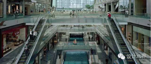 建筑二层的一座人行天桥作为疏导场所冲出Iluma,跨越街道,延伸到街对面与对面的建筑体形成连廊,连廊顶部装饰著Ilumn内部的黑白灰图案,即指明动向,又将整个项目从内之外的与整体环境形成交流。为了方便顾客和行人,所有通道都通向主厅,并向四周发散。