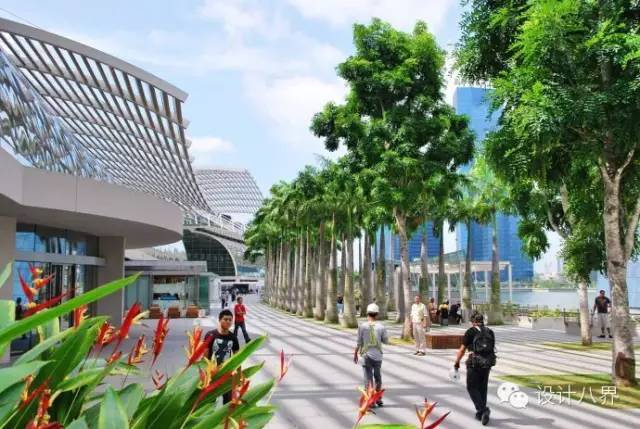 在改造中,以河道形成的线性空间作为公共活动的轴线,整合沿岸各个空间节点。新加坡河两岸分别设置了15m宽的连续人行步道,串联沿线的各种功能和旅游吸引物。为适应当地的湿热气候,在滨水建筑的首层设置连续的“有顶人行道“(covered walkway)。在人流较多的驳船码头和克拉克码头,人行步道主要以室外家具的设置分割活动的区域,为人们提供更多的活动空间;而在人流较少的罗伯逊码头,通过适当的绿化地带,塑造安静、私密的空间氛围,与周边的酒店和居住功能相适应。