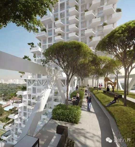 私人阳台提供公寓大型室外空间和个人的种植面积。通过开阔的屋顶花园、具有热带景观的天台和层叠的阳台增加绿色自然环境。同时将地面车辆的流通率减少到最低限度,使得项目的绿化面积达到最大化。此外加上对日照、风量和基地微气候条件所进行的环境分析,以及低耗能战略的引入。树木,植物和花卉是组成住宅计划的一部分,为居民提供一个郁郁葱葱的热带环境,享受休闲活动的设置。