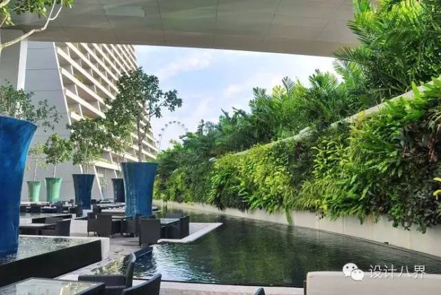 建筑流动的几何体给人一种高耸入云之感,塔楼每隔三层客房拥有悬挑的空中花园,上面种满了热带植物,它已成为城市绿地的一部分,与邻近公园融为一体。酒店拥有自我遮阳功能,悬挑而出的空中花园和相邻的三座酒店客房大楼都能起到遮阳的作用,客房楼层立面采用低辐射玻璃。酒店顶楼的屋顶花园可将全城风光一览无余,独家兰花贵宾会所位处该层,并配有私人会议空间、图书馆和专用的贵宾会所门房。酒店五层设有可俯瞰城市的无边界泳池,设备先进的健身中心,特色的鸟笼休息凉亭及长达300米花园走道。