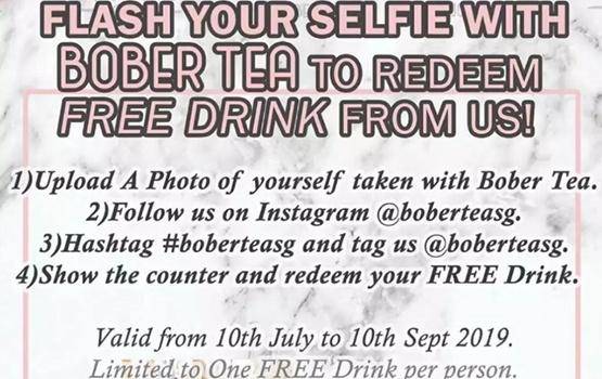 介绍:在社交媒体Instagram上,上传一张和Bober Tea饮品的合照,@boberteasg 并加上标签 #boberteasg,出示照片,即可获得免费奶茶!只限每天首50名顾客。