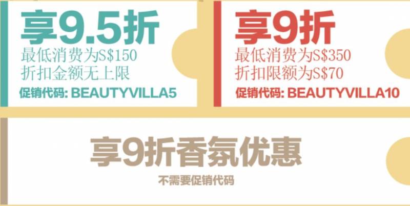 7月11日至31日期间,在ishopchangi上购买美妆产品消费满150新币,使用折扣码【BEAUTYVILLA5】即可享受额外95折优惠;消费满350新币,使用折扣码【BEAUTYVILLA10】即可享受额外9折优惠(最高抵扣70新币);香氛类产品无需促销码,无门槛9折!