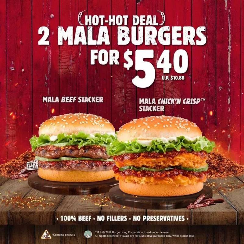 Buger King放出优惠:原价10.8新的Mala Burgers系列2个只需要5.40新!包括Mala Beef Stacker和Mala Chick'n Stacker,快和小伙伴一起约起来吧!