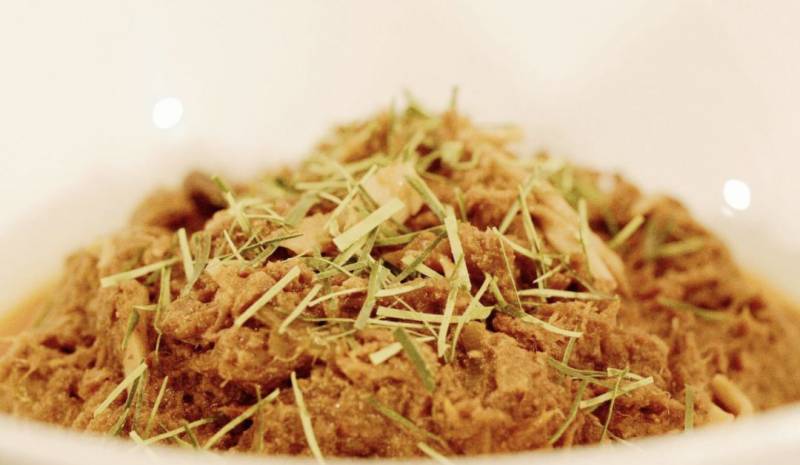 仁当,简单来说就是炖牛肉。这道菜源自印尼,一般出现在婚礼等重要的宴会上。