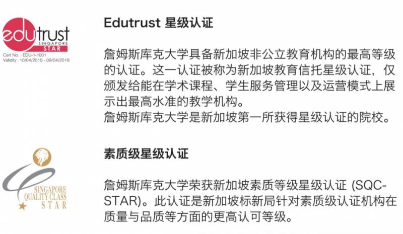 受澳大利亚国家英语语言教学评审计划署(NEAS)认可。詹姆斯库克大学新加坡校区是新加坡唯一获得这一质量标志的大学。