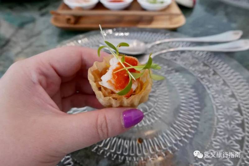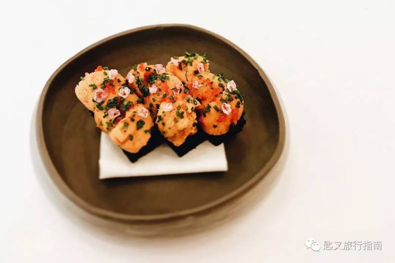 是日有幸一尝主厨特别准备的菜单,从amuse bouche起便火力全开。上图左上角,外层华夫口感卷饼,包裹着温热咸鲜的芝士,毫无防备地在口中爆浆,好似烟花绽放,微微上头~