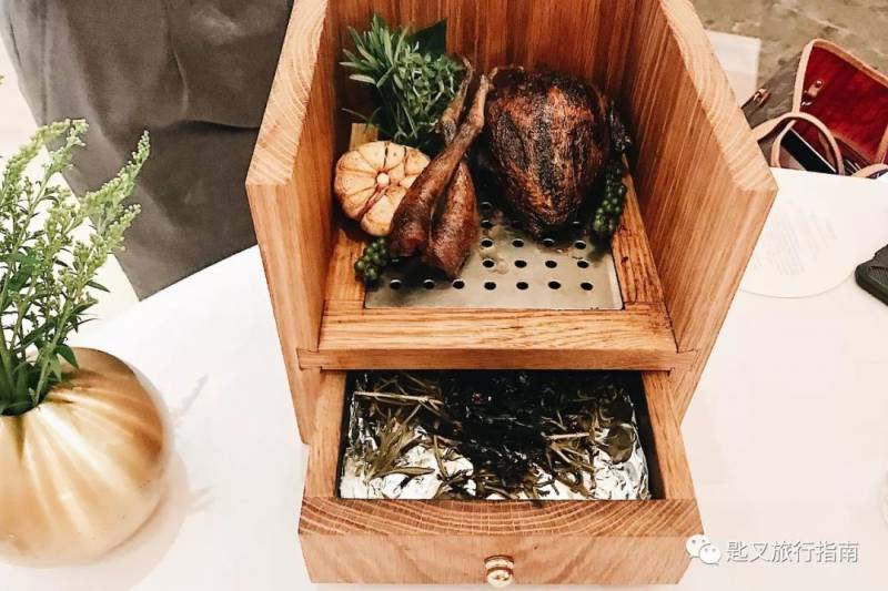高潮始于一只方形木盒,打开后烟雾缭绕,主角静静躺在里面,焦脆的表皮无比诱人。Chef Julien痴迷于同种食材的多重演绎,这次又为乳鸽的不同部位定制了三种吃法:鸽胸肉先烤再用花椒烟熏,嫩度刚刚好,鸽皮香脆,紧紧锁住肉汁,从口感到风味都是一道上乘之作,可算是人生食鸽之巅峰了。