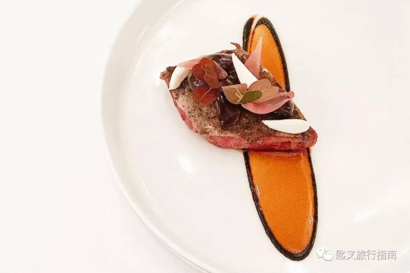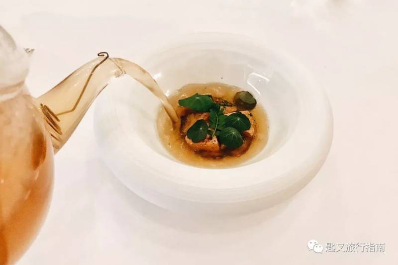 这道打引号的农家肉汤,原本汤里的蔬菜替换成了鲍鱼鹅肝,澄清的香菇清汤赋予这道菜几分文雅,同时也让我想起了另一位热爱清汤的Chef Josean Alija (点击温习Nerua)。两间世界上最出色的博物馆餐厅,气质又是如此相近,难怪两位Chef合作无间,在Odette联弹之后,11月还将移师西班牙,感兴趣的朋友们一定要密切关注。
