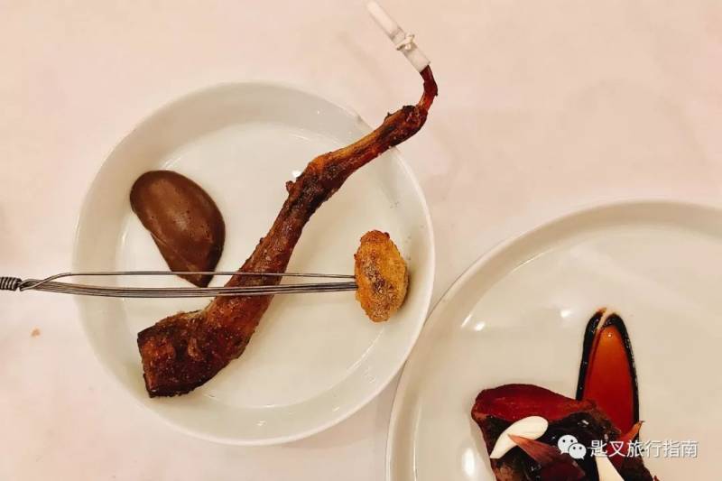 鸽腿肉质更韧,油封做法逼出干香,脚腕上还包着一张小纸条,不知道会跟你说什么秘密呢?腿的两侧是酥炸的鸽心,沾另一侧的鸽肝酱同食,许是另一维度的原汤化原食。