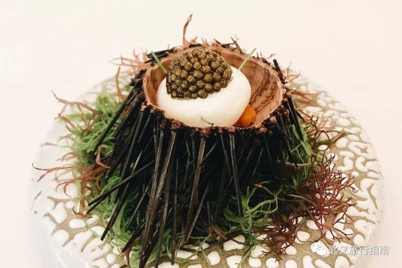 北海道海胆两吃。海胆每周三次空运到店,保证新鲜度。海胆,斑点牡丹虾塔塔,青口贝云朵泡沫,皇家鲟鱼子酱在海胆壳中层层堆叠,绵密与爆破口感交织,umami几何级扩大,另一道更为简单直接,海胆肉厚厚堆在墨鱼汁做的黑色吐司上,仿佛再多一囊就会坍塌,给海胆控的纯粹极致快感。