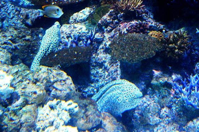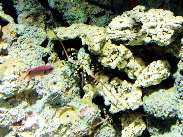 还有一种鱼很特别,不但形象长得特别,它的生活方式也很特别。四条鱼,浑身上下是黑白相间的小点状,看不到鱼眼?在水里也不游动,头和上半身露在外面,下半身和鱼尾则身在海底世界的礁石里。它们不怎么动,就那么站着,摇弋和漂浮着,这是我从来没有见过的一个鱼的种类。