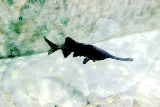 前面有两颗坚硬牙齿的鲨鱼 这种鲨鱼比较厉害 估计能咬断人腿