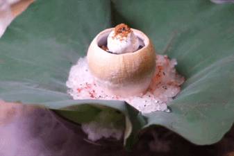 同乐轩利用鲍鱼的质地富有吸收能力的特点,选用日本昆布包裹着鲍鱼。在热力的作用下,昆布的鲜味渗透到鲍鱼中,很好地提升了鲍鱼的鲜美度。肥嫩的鲍鱼带有海水的鲜味,口感十分细腻。