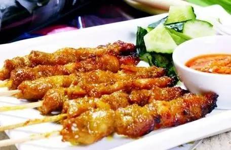 沙爹是将腌好的牛肉、羊肉、鸡肉串成串以适度的火候炭烤后,再蘸一层厚厚的沙爹酱一起入口。