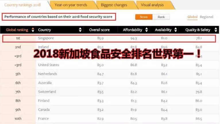 新加坡食品安全位列世界第一位,远超美国,第三位是英国。新加坡是首次进入第一的亚洲国家。在食品安全分项指标中,新加坡得到了几乎满分。