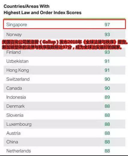 2018年《全球法律与秩序》报告中,新加坡被评为全世界治安最好的国家。