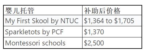 My First Skool by NTUC: 这家性价比高,价格在1364-1705新币/月,公民有补助700新币/月,比较难申请到,可能需要在waiting list里等待空位。