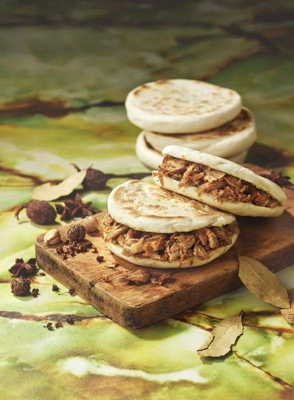 肉夹馍,古汉语“肉夹于馍”。制作肉夹馍的所使用的肉一般酱肉酥烂,滋味鲜长。正由于选料精细,调料全面,火功到家,加上使用秘制的陈年老汤,包上酥软的白吉馍,才使西安的肉夹馍与众不同,别有一番风味!