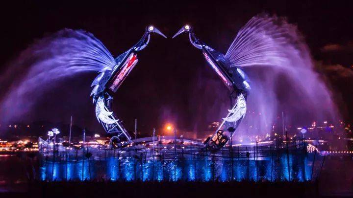 位于圣淘沙岛上的一个免费的喷泉表演。讲述的是一段用仙鹤来表现的爱情故事。集故事、表演、灯光、喷泉、烟火为一体。免费界的良心之作。一般要天黑以后才会有表演,似乎是在9点和9点半。
