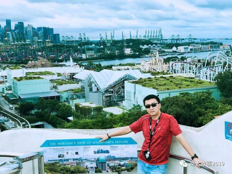 然后就是排队乘坐直梯上塔,因为塔内部空间也很小,每次上去的人都要排成一队前行,到塔尖的鱼尾狮嘴处,有一个印度或是马来姑娘(工作人员)给你拍照,动作娴熟利落。然后就可以上到最顶端露台,可以俯视圣淘沙全景啦,景色还是不错的!