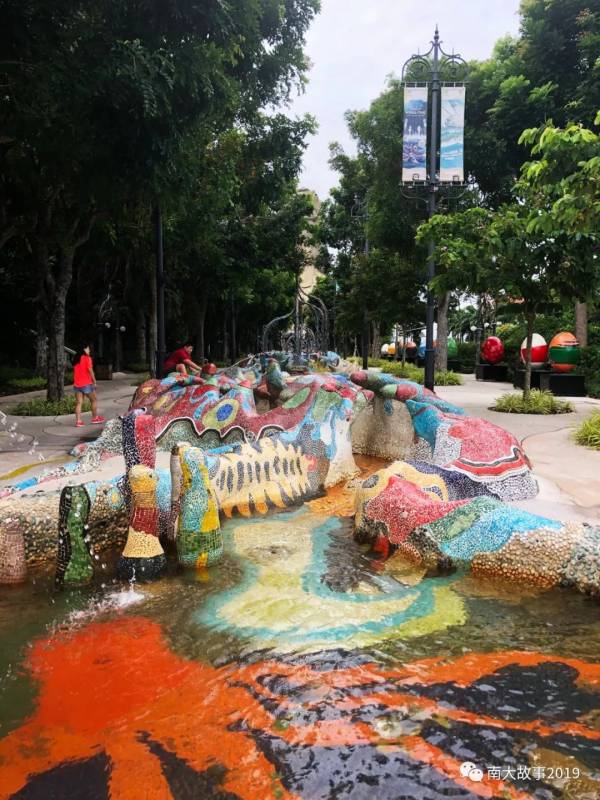 从鱼尾狮塔向东有一个喷泉碎石道,各种颜色的碎石和玻璃被设计成一条七彩的喷泉公园主道,走到尽头就到了第三站海滩。