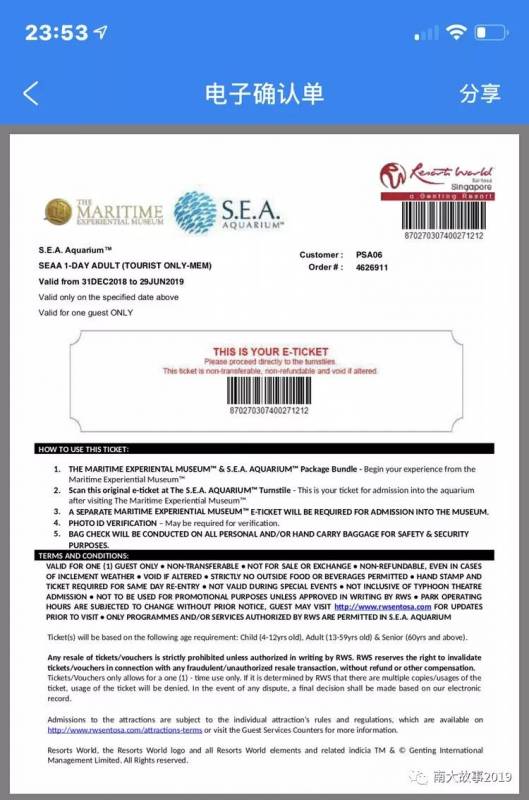 ——S.E.A海洋馆和ADVENTURE COVE水上乐园都是从海事博物馆入口进入。在携程网提前预定了海洋馆的门票电子票(约34新币),一般都是海事博物馆和海洋馆的联票,一定要买联票,因为海事博物馆非常值得一去,特别是带小朋友的,非常长知识。携程网会发一个电子确认单,用手机下载或截屏保存后,直接出示这个确认单即可。
