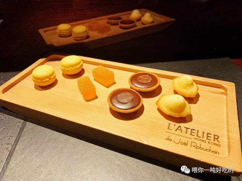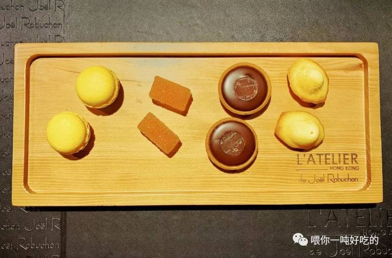 餐厅送上的petit four从左到右是柠檬马卡龙,菠萝啫喱糖,巧克力塔,和法式小蛋糕。