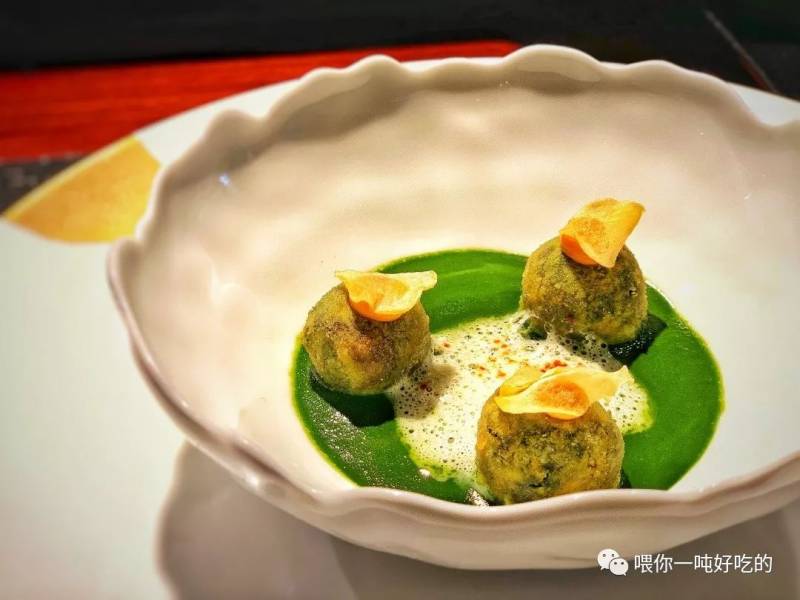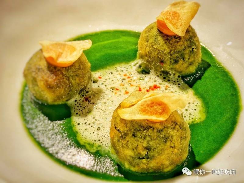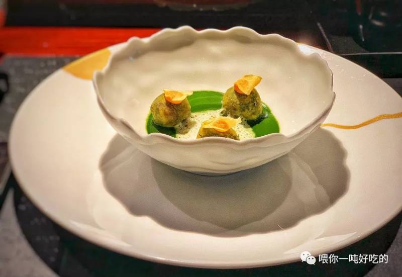 勃艮第蜗牛,法国高档餐厅的常客,被做成了三个可爱的小丸子点缀在欧芹酱中,里面还有一点蒜香卡仕达。