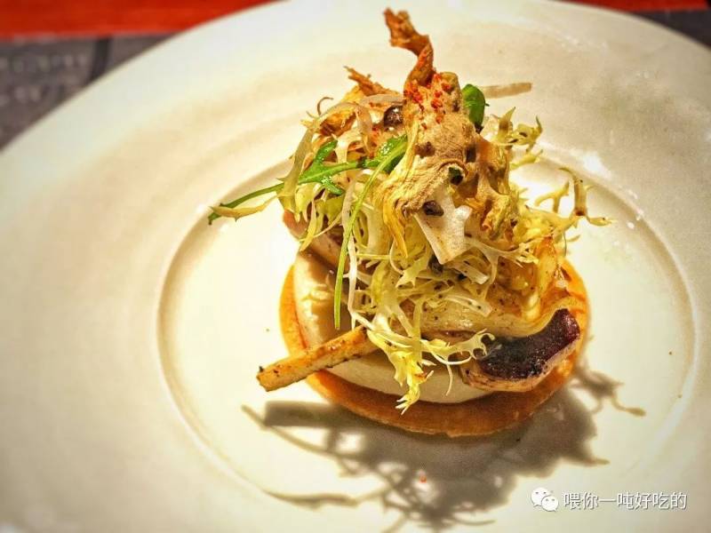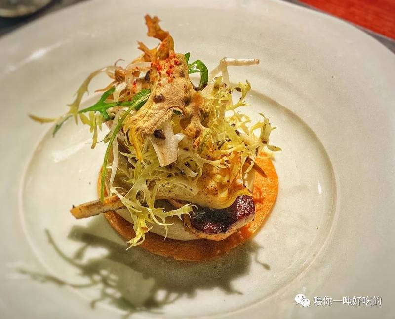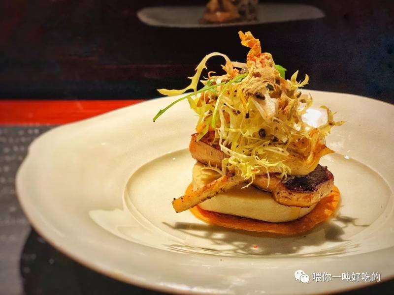 上面随性的洒满了蓬松的法国洋蓟,中层则是拥有奇妙吸引力的鹅肝,底层是一层薄薄的金黄色脆饼。