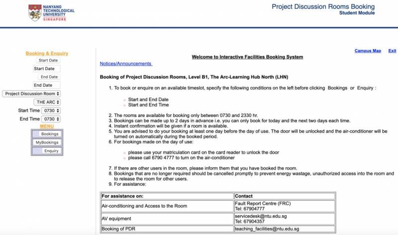 讨论室(Project Discussion Rooms)位于Level B1, The Arc-Learning Hub North (LHN) ,带有空调及多媒体设施,使用时间为07:30~23:30。