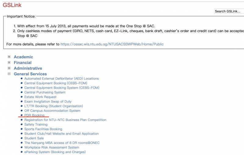 登陆GSLink——选择General Services——选择PDR Booking——预约自己想要的讨论室及时间即可。
