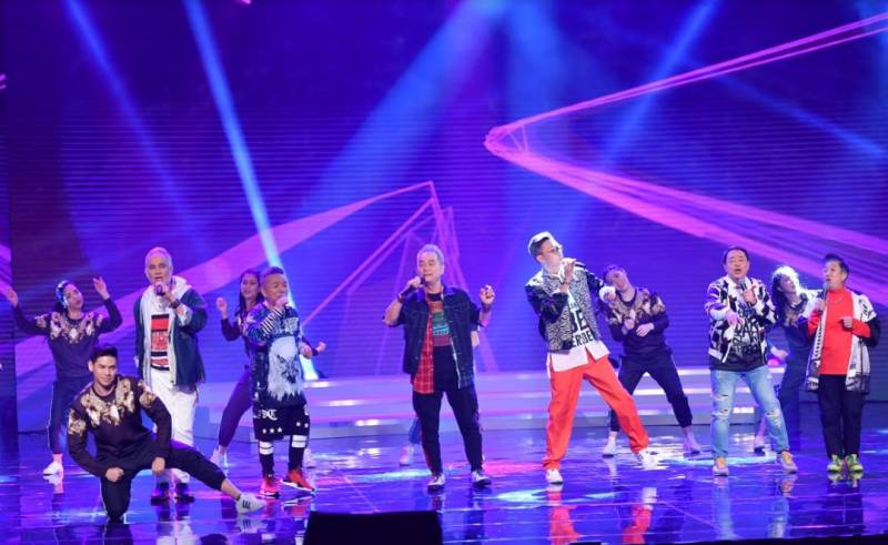 资深艺人陈建彬、陈旭辉、刘谦益、李国煌、王利秦、朱厚任带来饶舌表演《五言同心为善乐》。这次表演中的饶舌歌曲是陈建彬大哥亲自操刀,里面包含五大方言外,歌词中还蕴含了善济的五大文化价值观“宽容、大爱、慈悲、感恩和祝福”,他们嘻哈的装扮,逗趣的表演下给观众带来的不仅仅是欢乐,更是大爱之心。