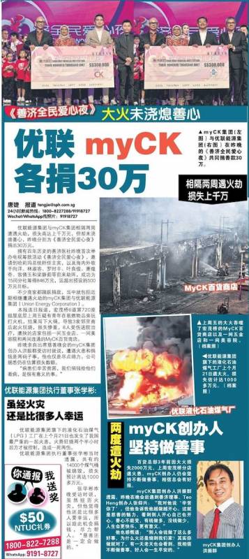 值得一提的是,刚刚遭遇了火灾的两个企业my CK和优联能源,尽管损失惨重但依然不忘为公益尽一分力量。“相信不断的做善事,好人会一生平安的”my CK的创办人在接受采访时说到。
