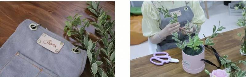 花艺师精心的将花材分配好,用花瓶装着,是工具也是背景。每个人会有一套完整的工具,包括:围裙, 花盒,花材,剪刀...