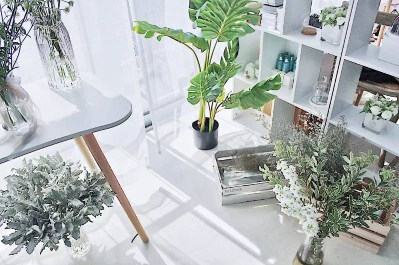 强烈的紫外线被白纱和玻璃阻隔在外面,白色调调的工作室放满植物,绿油油的植物映衬着白墙,打下的光影都让温度瞬间降下来。