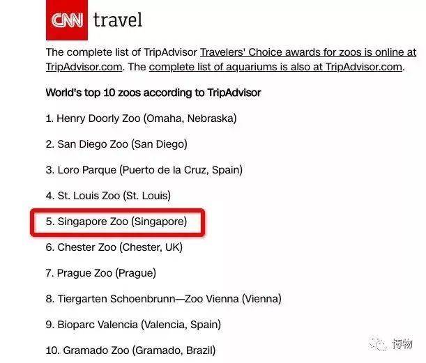 某国外旅行网站评选出的世界十大最佳动物园名单,新加坡动物园排名第五。
