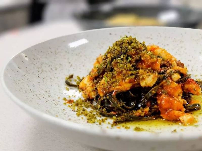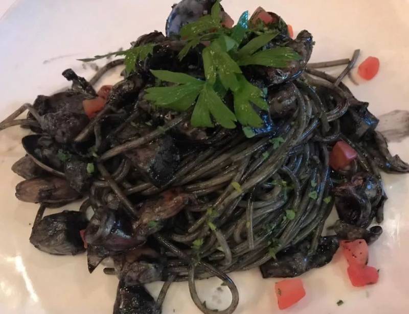 餐厅最受欢迎的一道菜非鱿鱼墨汁海鲜意大利面莫属了。这款“黑色”意面具有天然芳香的海洋香气,各式各样的海鲜,小龙虾,扇贝,虾,蛤蜊和鱿鱼。